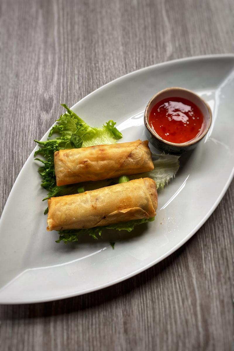 Hjemmelaget vårruller med storfekjøtt og hodekål. Serveres med syltet salat og sweet chilisaus.
