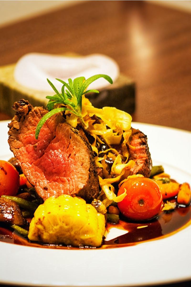 Serveres med baby gulrot, asparges, sukkererter, maiskolber og hjemmelaget rødvin saus.