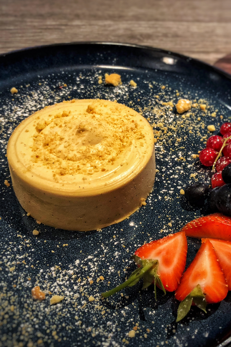 Hjemmelaget brunostmousse med bærsaus og sukker-smør kjeks.