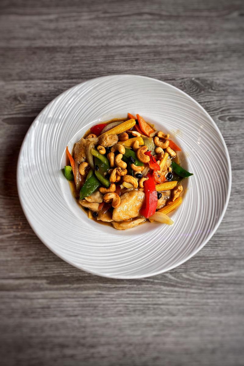 Serveres med gulrot, sukkererter, løk, baby mais og ris.