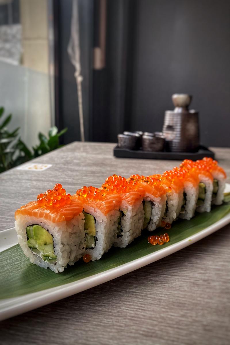 Avokado, agurk, Philadelphia og laksrogn, top med laks