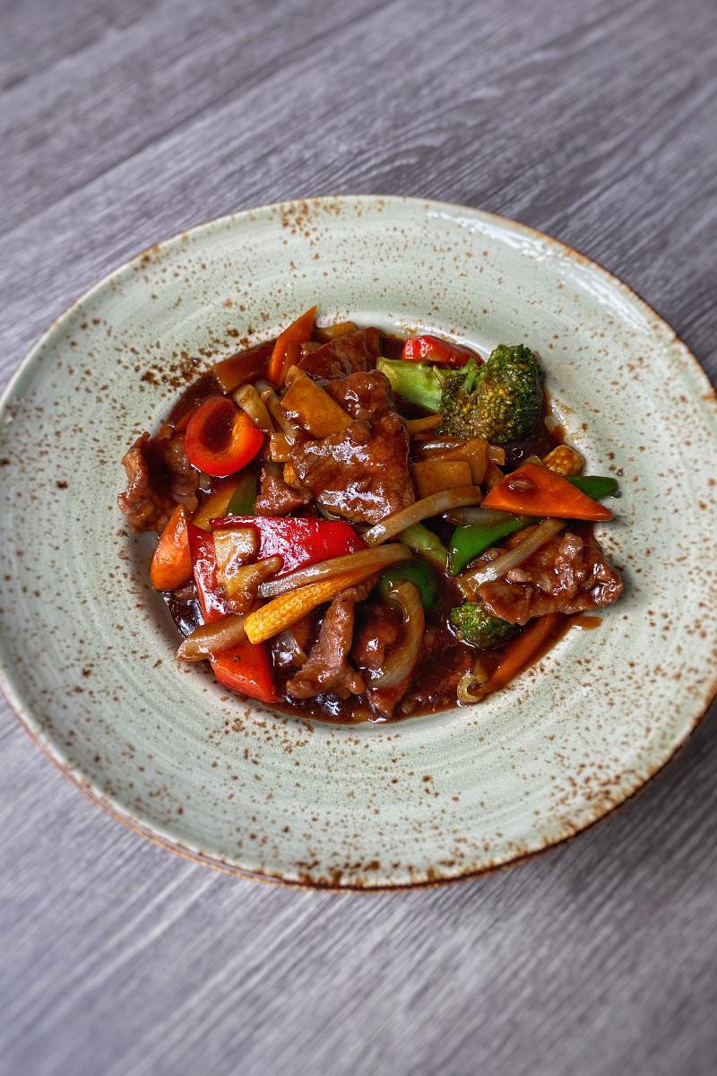 Serveres med bambusskudd, løk, paprika, squash, gulrot og ris.