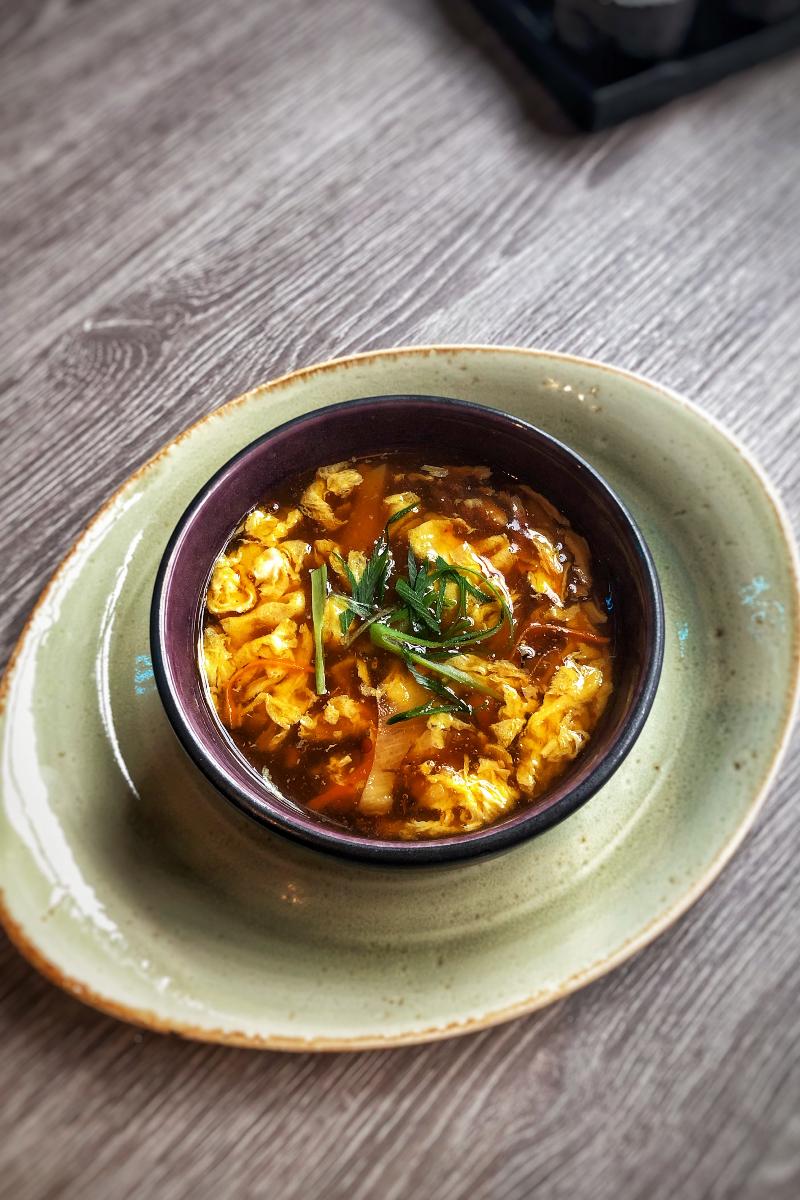 Klassisk sterk og sur suppe med egg, skinke, bambusskudd og gulrot.